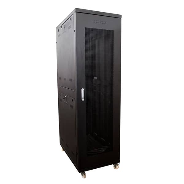 رک ایستاده 42 یونیت با عمق 100 می باشد.رک مدل KS42100DFBGدر عمق100 سانتیمتر و ارتفاع 42 یونیت و در استاندارد 19 اینچ و با بدنه ی مقاوم از جنس فلز و رنگ الکترواستاتیک مشکی ضدخش تولید شده است و نیز دارای درب مشبک با قفل ریتال و درب های جانبی و پشت بصورت بازشو همراه با قفل سوییچی و نیز از ورودی و خروجی کابل از بالا به پایین بهره می برد ،قابل ذکر می باشد که رک ایستاده 42 یونیت با عمق 100 قابلیت نصب 3 عدد فن اضافه، پایه تنظیم و درب توری در جلو و عقب رک جهت اتاق سرور و تهویه هوای بهتر را دارا می باشد